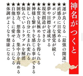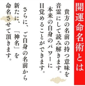 貴方の名前の持つ意味を音霊にして読み解きます。本来の自身のパワーに目覚めることができます。さらに、ご自身の名前から新たに【神名】を命名させて頂きます。